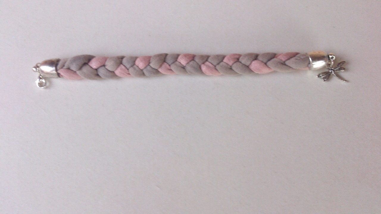 pulsera conpuesta por hilo de trapillo ,terminada con dos piezas zamak y cierre de mosquetón con un pequeño charms de mariposa